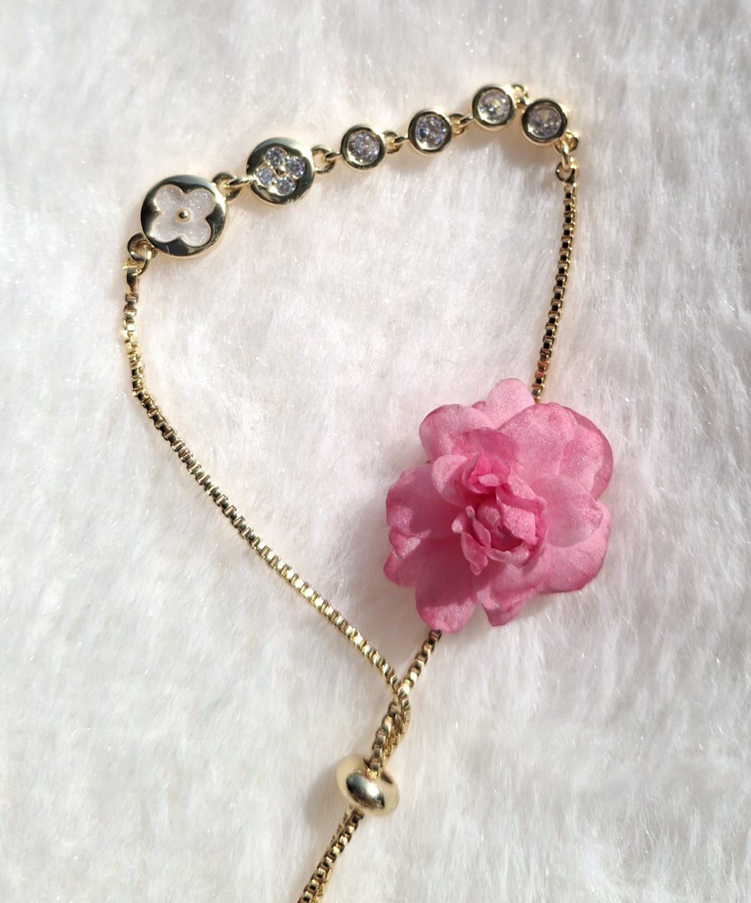Pulsera dorada con delicados detalles brillantes, diseñada para aportar un toque romántico y femenino a tus looks. Una pieza sutil que combina elegancia y encanto en cada detalle.